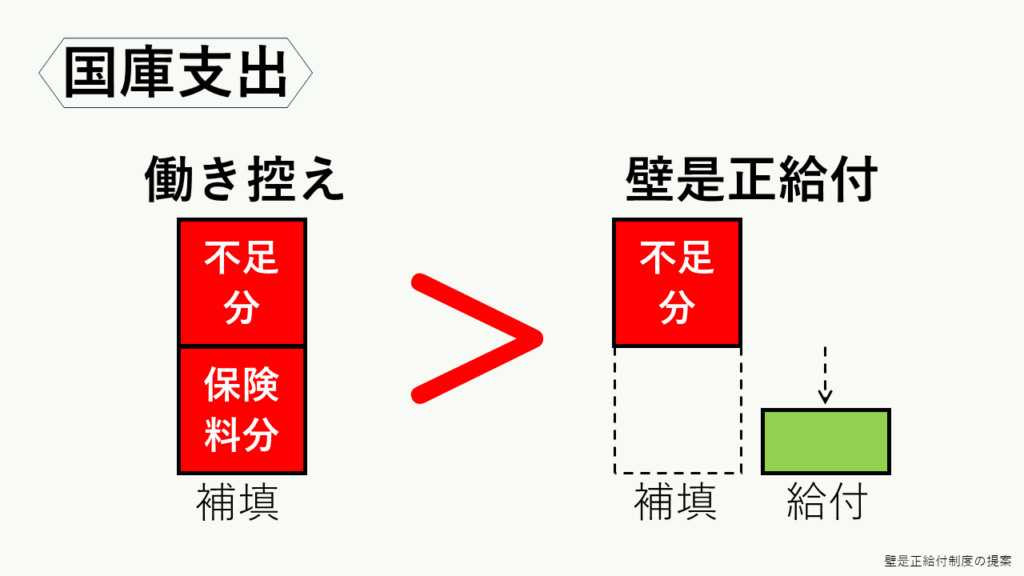 給付金によって手取りの逆転現象が解消されると、その結果、保険料が納付されて、トータルの国庫支出は減少します。