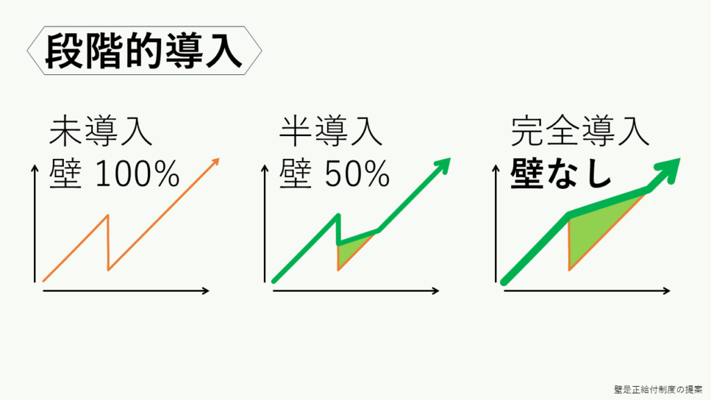 「壁是正給付制度」は、段階的な導入が容易です。一気に導入するのではなく、数年かけて段階的に導入することで、社会構造の変化はゆるやかなものになります。