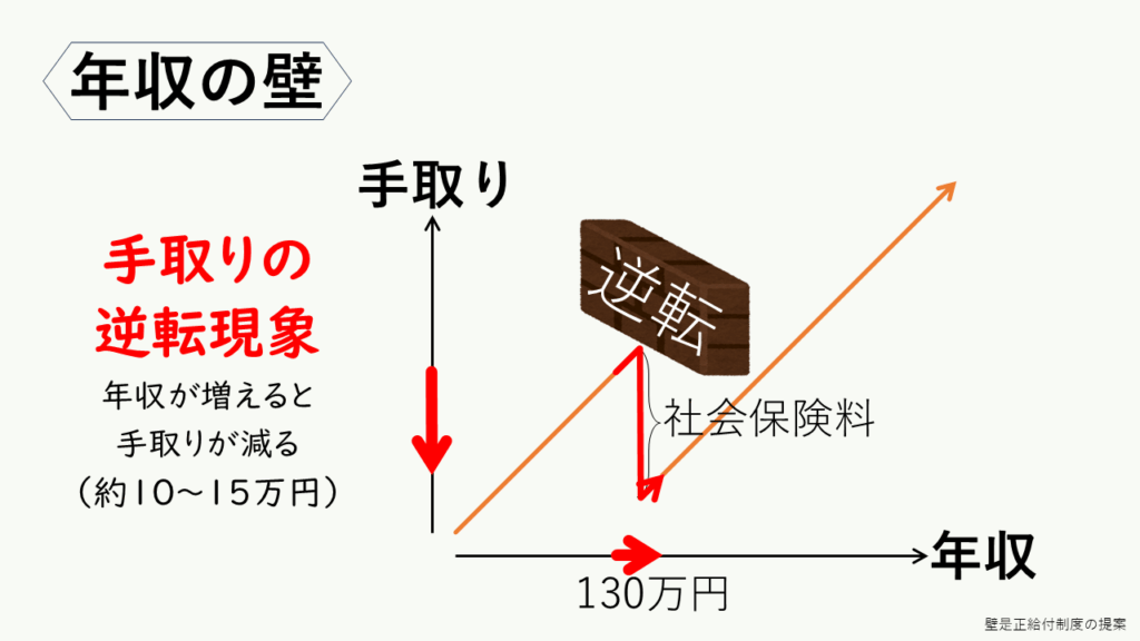 年収の壁とは、年収が130万円などの一定額を超えると、それまで免除されていた社会保険料の支払いが生じ、年収が増えたのに手取りが減ってしまう、いわゆる「手取りの逆転現象」が起きる問題です。