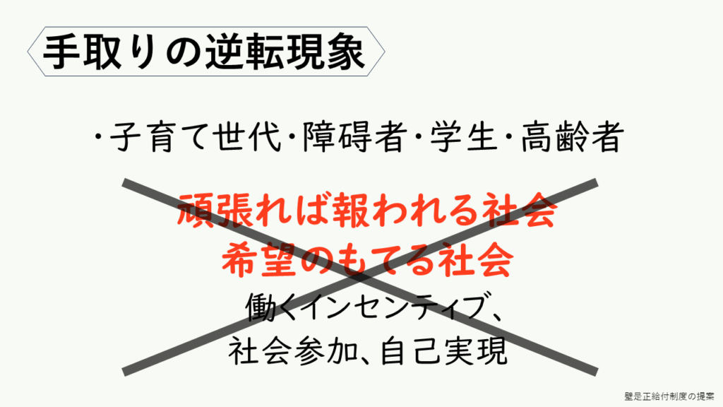 この逆転現象は、子育て世代、障碍者、学生、高齢者など、幅広い層に関わる問題です。